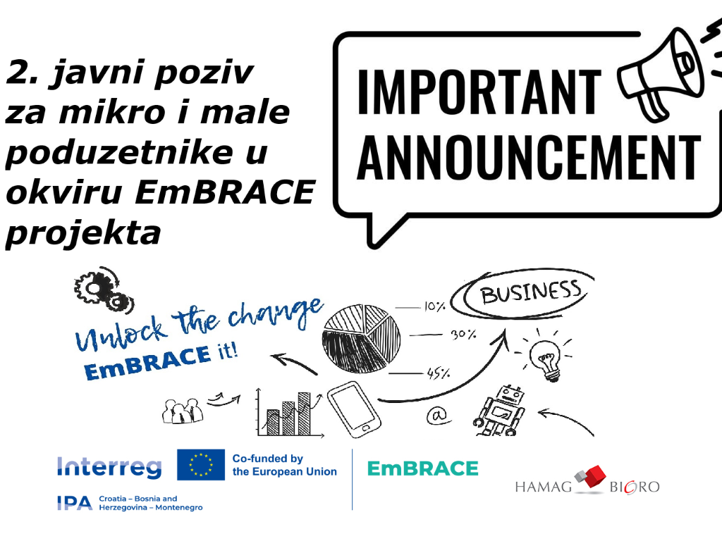 Hrvatska agencija za malo gospodarstvo, inovacije i investicije (HAMAG-BICRO) objavljuje 2. Javni poziv za dostavu projektnih prijedloga mikro i malih poduzeća s pograničnog područja Hrvatske, Bosne i Hercegovine te Crne Gore, u okviru EmBRACE projekta.
