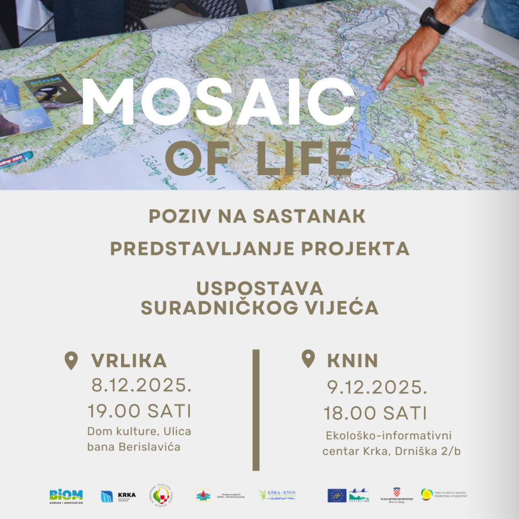 Udruga Biom poziva sve zainteresirane, a posebno stočare koji se bave ekstenzivnom ispašom, na informativni sastanak na kojem će biti predstavljen projekt Mosaic of LIFE te mogućnosti suradnje. Suradničko vijeće zamišljeno je kao povremeni neformalni sastanci putem kojih projektni tim sa zainteresiranom lokalnom zajednicom redovito razmjenjuje informacije o provedbi projekta, prikuplja iskustva i savjete te se konzultira o provedbi aktivnosti na terenu.