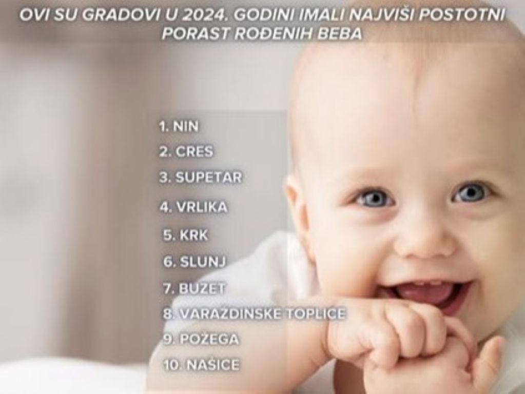 Najveći postotni rast rođenih beba imali su pak: Grad Nin, Grad Cres, Grad Supetar, Grad Vrlika, Grad Krk, Grad Slunj, Grad Buzet, Grad Varaždinske Toplice, Grad Požega i Grad Našice.